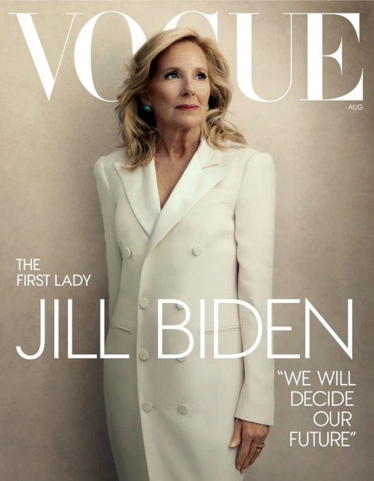 In the current edition of Vogue, First Lady Jill Biden (above) says she’s miffed because the American people don’t know about all the many fabulous things her husband as done for them.